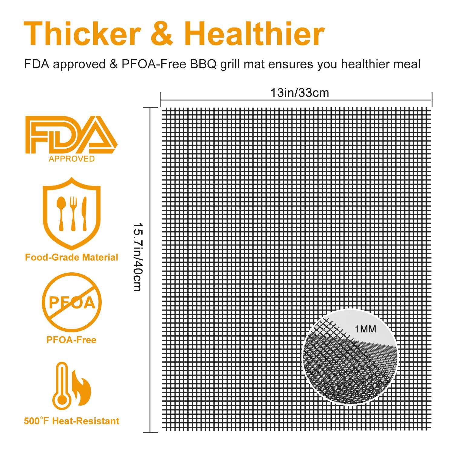 *FIT FOR ANY GRILL*:The gill mat is suitable for grilling meat,vegetable,pizza and more,easily fitting into any gill,stove,pan,cake tin or oven liner and preventing your food from falling or sticking to the grill.